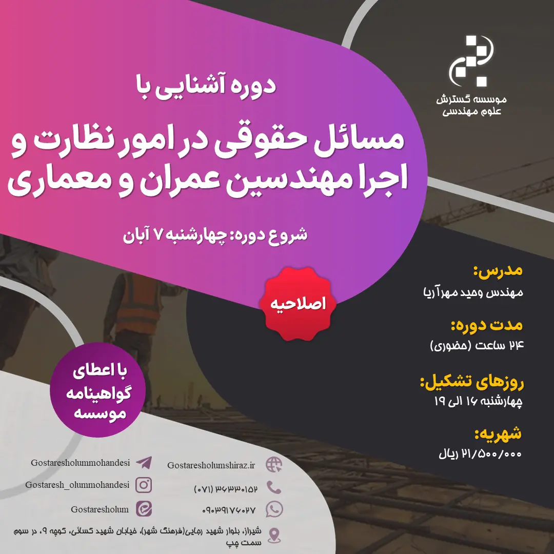 دوره آشنایی با مسائل حقوقی در امور نظارت و اجرا مهندسین عمران و معماری به همت موسسه گسترش علوم مهندسی با هدف تربیت و توانمندسازی مهندسان به صورت حضوری در 24 ساعت برگزار می گردد.